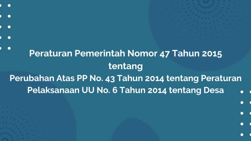 Peraturan Pemerintah Nomor 47 Tahun 2015 Tentang Perubahan Atas PP. No. 43 Tahun 2014 Tentang Peraturan Pelaksanaan Undang-Undang No. 6 Tahun 2014 Tentang Desa bertujuan untuk optimalisasi penyelenggaraan Pemerintahan Desa, pelaksanaan pembangunan Desa, pembinaan kemasyarakatan Desa, dan pemberdayaan masyarakat Desa. Peraturan ini juga menyempurnakan Peraturan Pemerintah Nomor 43 Tahun 2014 tentang Peraturan Pelaksanaan Undang-Undang Nomor 6 Tahun 2014 tentang Desa untuk lebih memperkuat asas kedudukan desa sebagai kesatuan masyarakat hukum serta keserasian dan sinergi dalam pelaksanaan pengaturan dan kebijakan mengenai desa. Desa adalah desa dan desa adat atau yang disebut dengan nama lain, selanjutnya disebut Desa, adalah kesatuan masyarakat hukum yang memiliki batas wilayah yang berwenang untuk mengatur dan mengurus urusan pemerintahan, kepentingan masyarakat setempat berdasarkan prakarsa masyarakat, hak asal usul, dan/atau hak tradisional yang diakui dan dihormati dalam sistem pemerintahan Negara Kesatuan Republik Indonesia.
