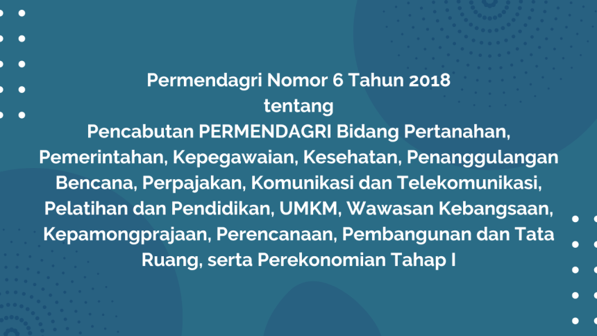 Permendagri Nomor 6 Tahun 2018 tentang Pencabutan PERMENDAGRI Bidang Pertanahan, Pemerintahan, Kepegawaian, Kesehatan, Penanggulangan Bencana, Perpajakan, Komunikasi dan Telekomunikasi, Pelatihan dan Pendidikan, UMKM, Wawasan Kebangsaan, Kepamongprajaan, Perencanaan, Pembangunan dan Tata Ruang, serta Perekonomian Tahap I, hal ini bertujuan untuk melakukan penyelarasan peraturan perundang-undangan sesuai dengan tugas dan fungsi penyelenggara pemerintahan di lingkungan Kementerian Dalam Negeri, perlu dilakukan pencabutan 50 (lima puluh) Peraturan Menteri Dalam Negeri.