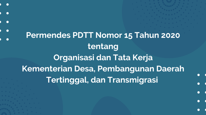 Permendesa PDTT Nomor 15 Tahun 2020 Tentang Organisasi dan Tata Kerja merupakan peraturan mengenai penjelasan mengenai struktur organisasi di tingkat Kementerian mulai dari jajaran tertinggi sampai dengan Staf Ahli. Kemudian penjelasan tersebut juga dilengkapi ruang lingkup tata kerja di setiap jajaran lingkup kerja yang ada di Kementerian.