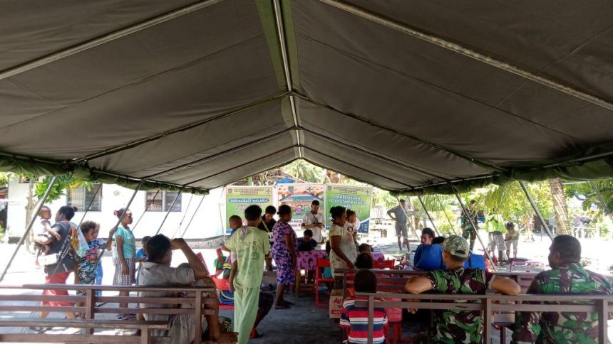 SARMI – Tentara Manunggal Membangun Desa (TMMD) memberikan pelayanan puskesmas keliling kepada warga Pulau Wakde, Distrik Pantai Timur bagian Barat Daya, Papua. Dalam program TMMD Ke-117 Tahun 2023 ini, Kodim 1712/Sarmi bertujuan memudahkan layanan kesehatan di daerah yang sulit dijangkau transportasi darat dan laut.